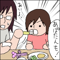自らお箸の練習を積極的にしていた娘、よちくんが食べている姿を見て、