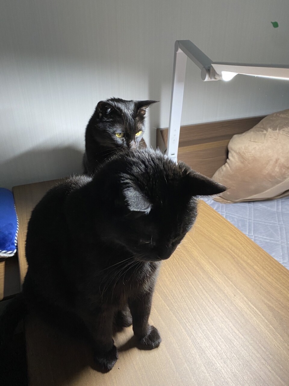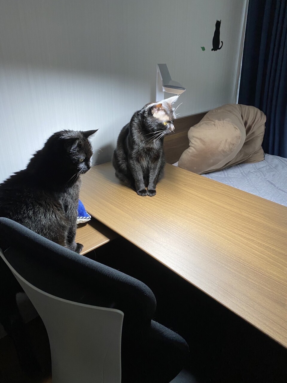 シンプルで カッコいいー😲 よけいな物がない! 私の職場の机ときたら 書類山積み ゴチャゴチャですよー ニャンズが 映えますね😍 また2人そろって この頃 ツーショツトが 多いですね アヤ容疑者の方が スミ刑事より 少し体が大きい 内股か がに股かで どっちかわかりますね 2人共 この机が 落ち着くのかな? あー 壁も カッコいいー😲 フニャコさんちは インテリアのセンスが すごいいいですね😉 見習いたいです