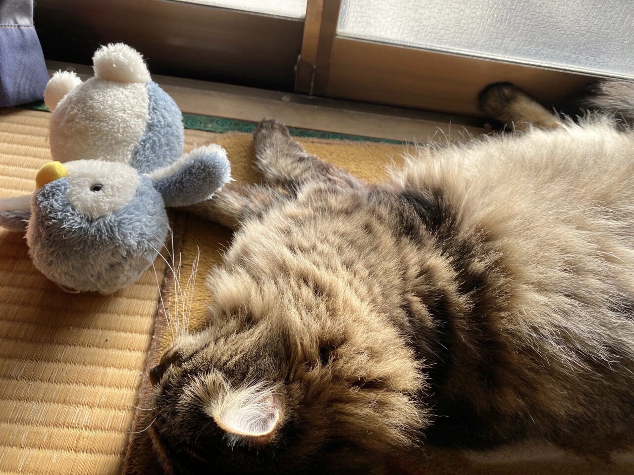 マロちゃんはなかなかのワイルドな乙女ですねえ。狩る時の動作がすごいです。ぺんぎんがだいすきですねえ。サイズもちょうど良いのでしょうか。よれよれペンギン額の目、目に見えてくれて嬉しいです(笑)ヨレヨレしても、お気に入りのものは相変わらず好きなのですねえ。何か見てるなあと思うと虫を見てることありますねえ。窓際のマロちゃんはちょうど良い太陽光で雰囲気が違って見えますね。マロはゴワゴワっぽくも見えますが毛が柔らかくてふわふわですね!マロちゃん可愛がってくださって嬉しいです。