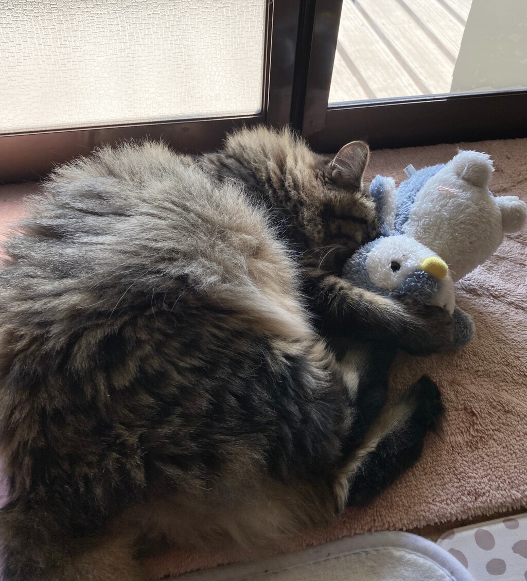 いろいろなぬいぐるみで遊ぶけど、やっぱり一番好きなのはこのペンギンのぬいぐるみ